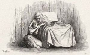 Ciao a tutti, sono la mercantessa, una donna vedova e senza neanche più un figlio. I miei cari sono morti per la stessa ragione per cui io mi trovo nel lazzaretto: la peste. Nella stessa mia capanna c’é una giovine ragazza, che proviene dalla provincia di Lecco. Si chiama Lucia, e mi tiene compagnia in questi giorni di agonia. E’ una ragazza molto affettuosa, vorrei avere una figlia come lei.. ma, mi ha raccontato del suo promesso sposo che dovrebbe arrivare a momenti, non vedo l’ora di conoscerlo! Nella conversazione tra Renzo e Lucia non ho capito molto, parlavano di un voto e che non si potevano più sposare. Appena il giovane se ne andò chiesi spiegazioni a Lucia, che mi raccontò la vicenda piangendo disperatamente: aveva fatto un voto alla vergine: se fosse riuscita a uscire dalla casa dell’Innominato, non avrebbe più sposato Renzo! Cercai di consolarla e le dissi che tutto andrà bene.